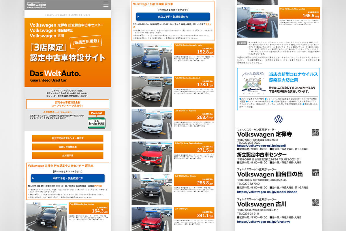 県内3店舗の認定中古車を紹介する特設サイトの制作と毎週の更新作業・Google広告出稿をオーダーいただいています。Google広告は効果測定のレポートを定期的に実施しています。